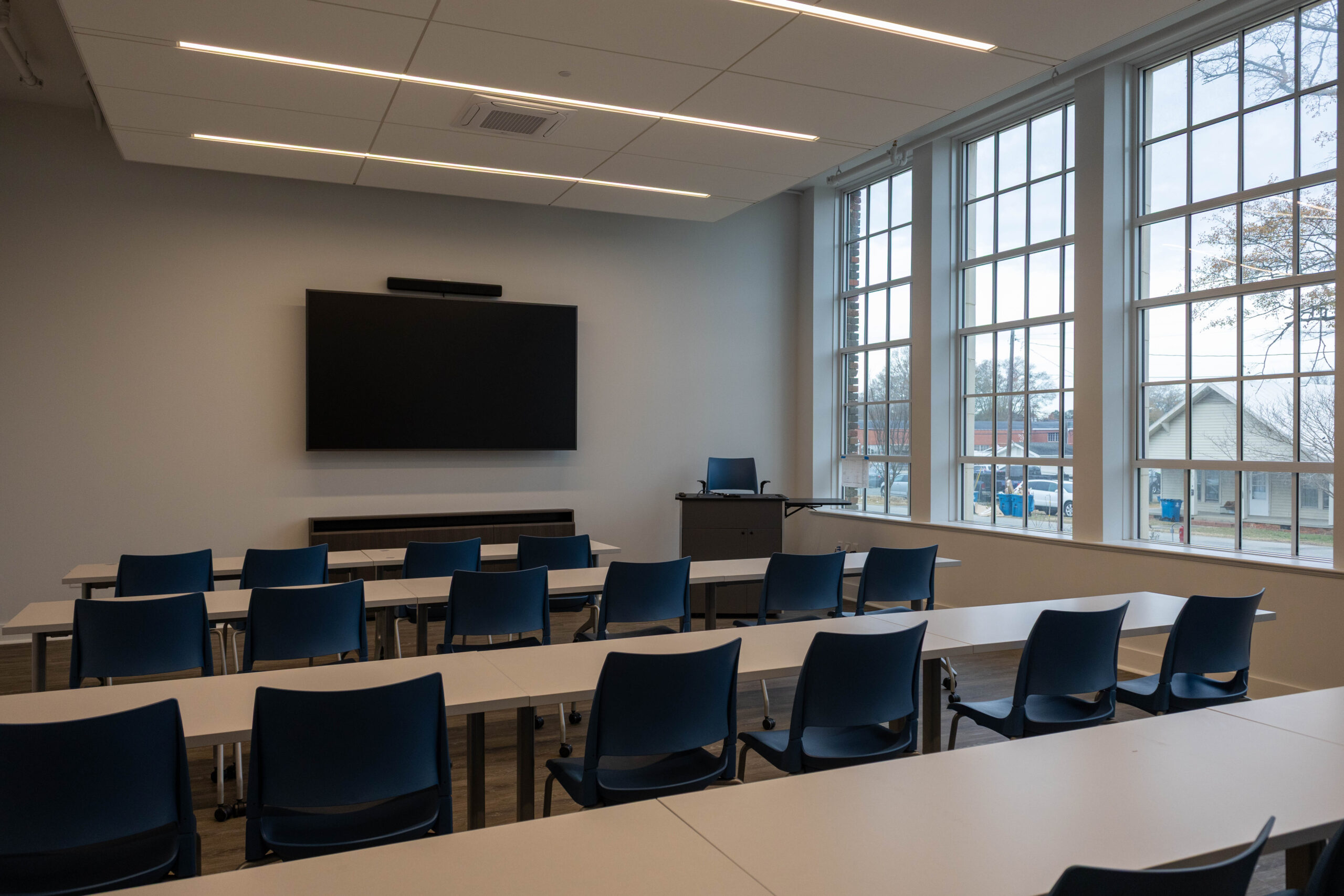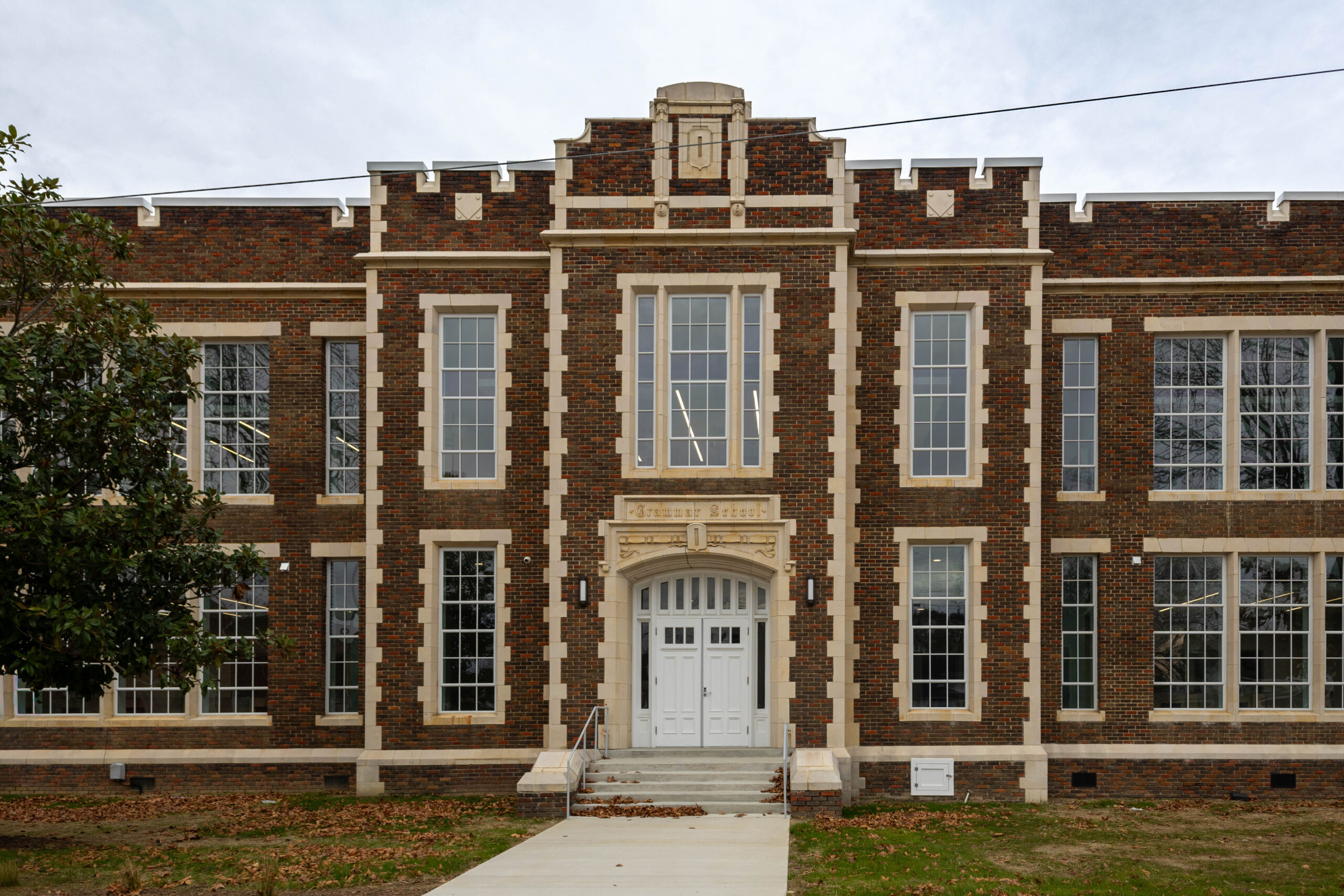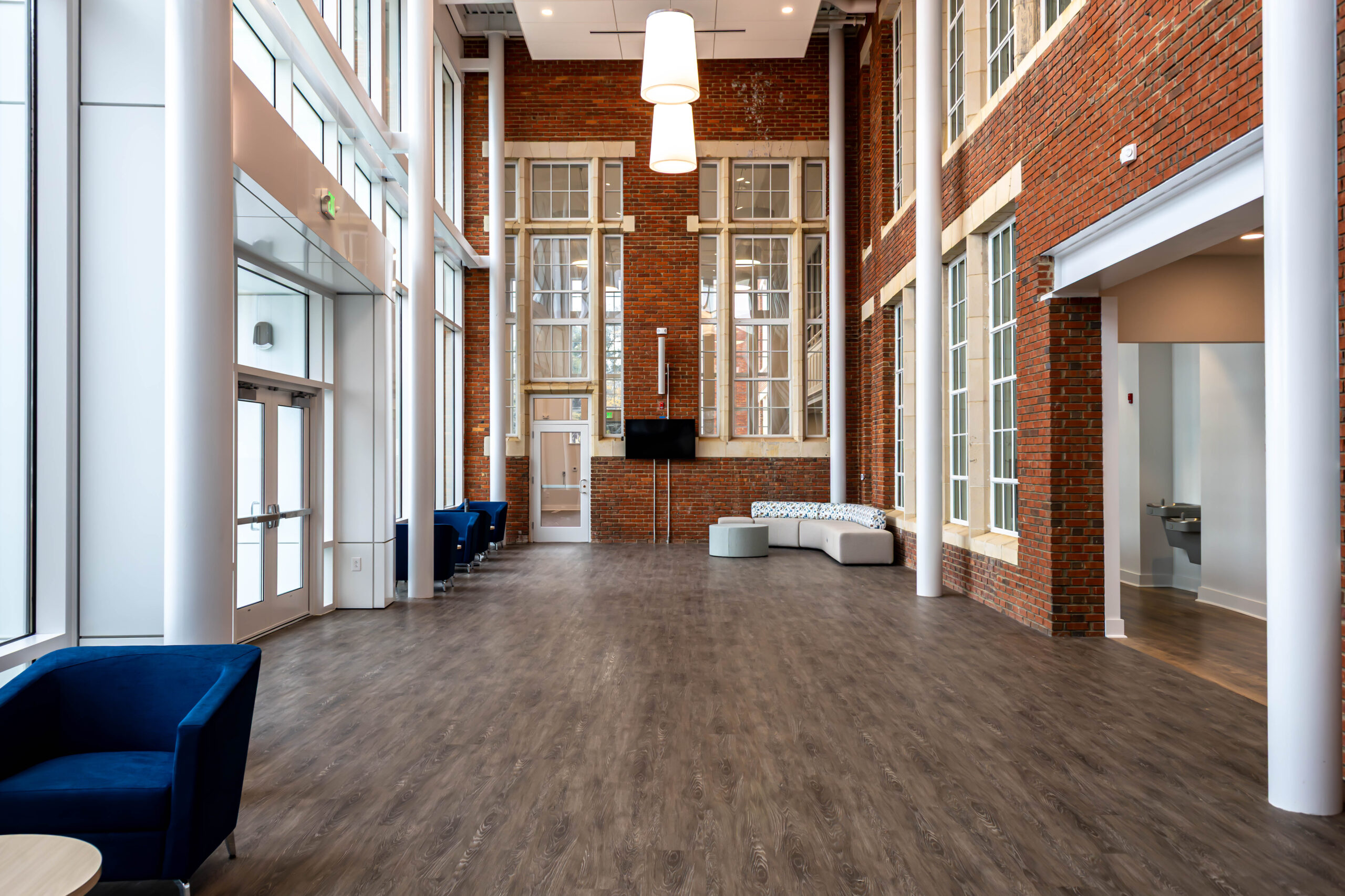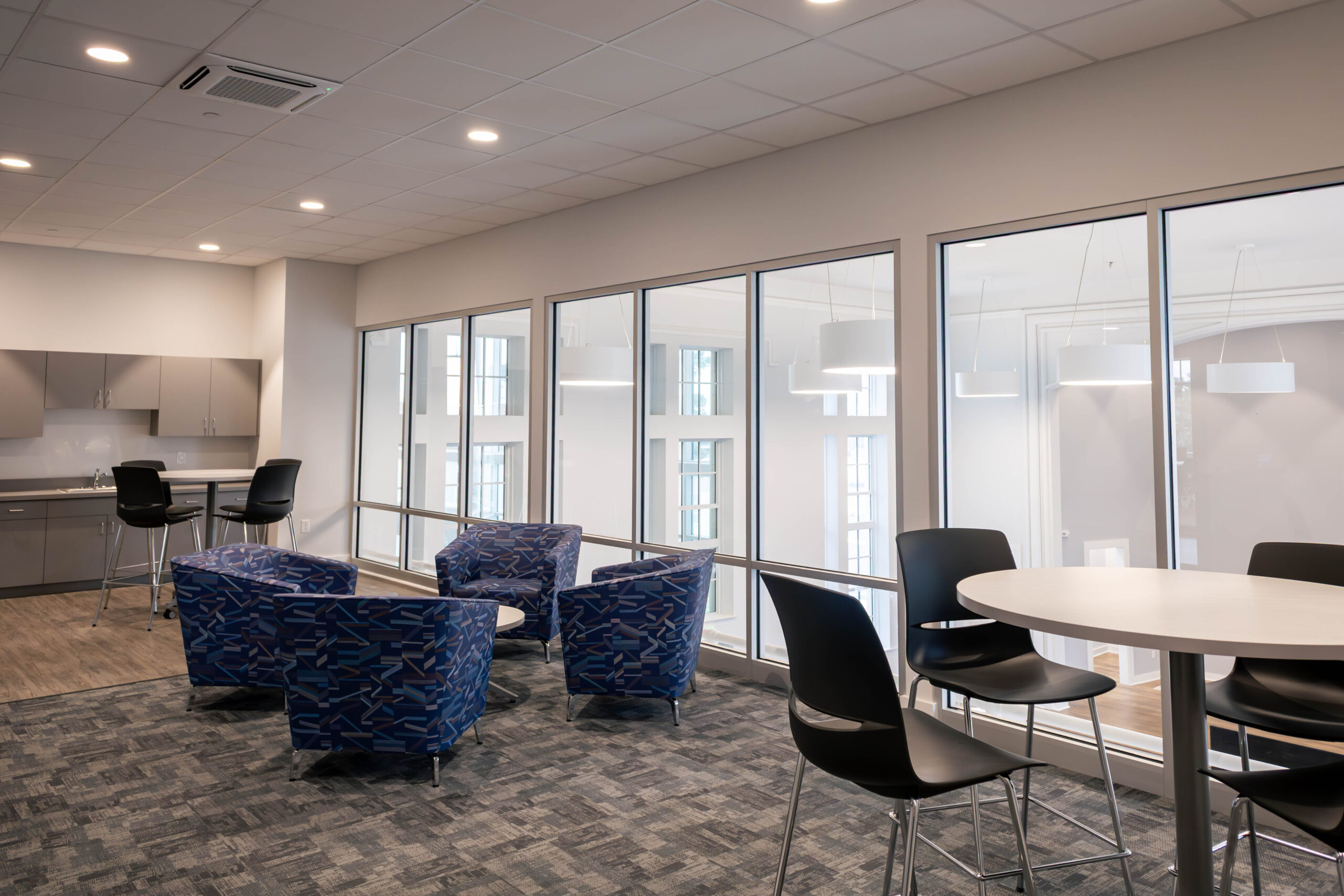 The project involved the renovation of approximately 30,144 square feet of existing space and the addition of a new 1,551-square-foot two-story lobby entrance constructed directly adjacent to the historic structure. Interior renovations reconfigured the building to accommodate classrooms, offices, meeting rooms, and event spaces, along with a fully renovated commercial kitchen and associated support areas. Building system upgrades included the installation of a new sprinkler system and a two-stop elevator located within the existing building to improve accessibility. Due to the age of the building, some of the project challenges included compromised frame members, steel sash windows, and removing plaster walls for new wall assemblies.