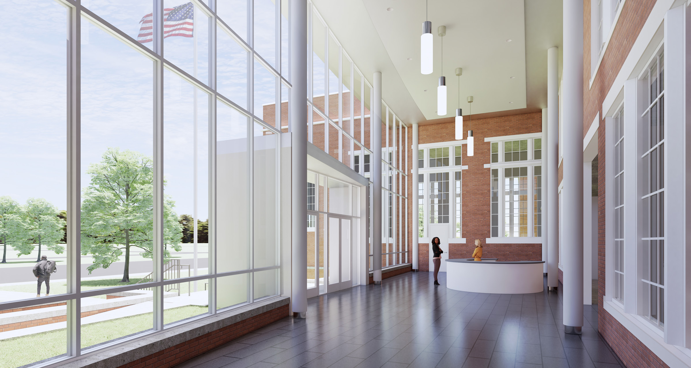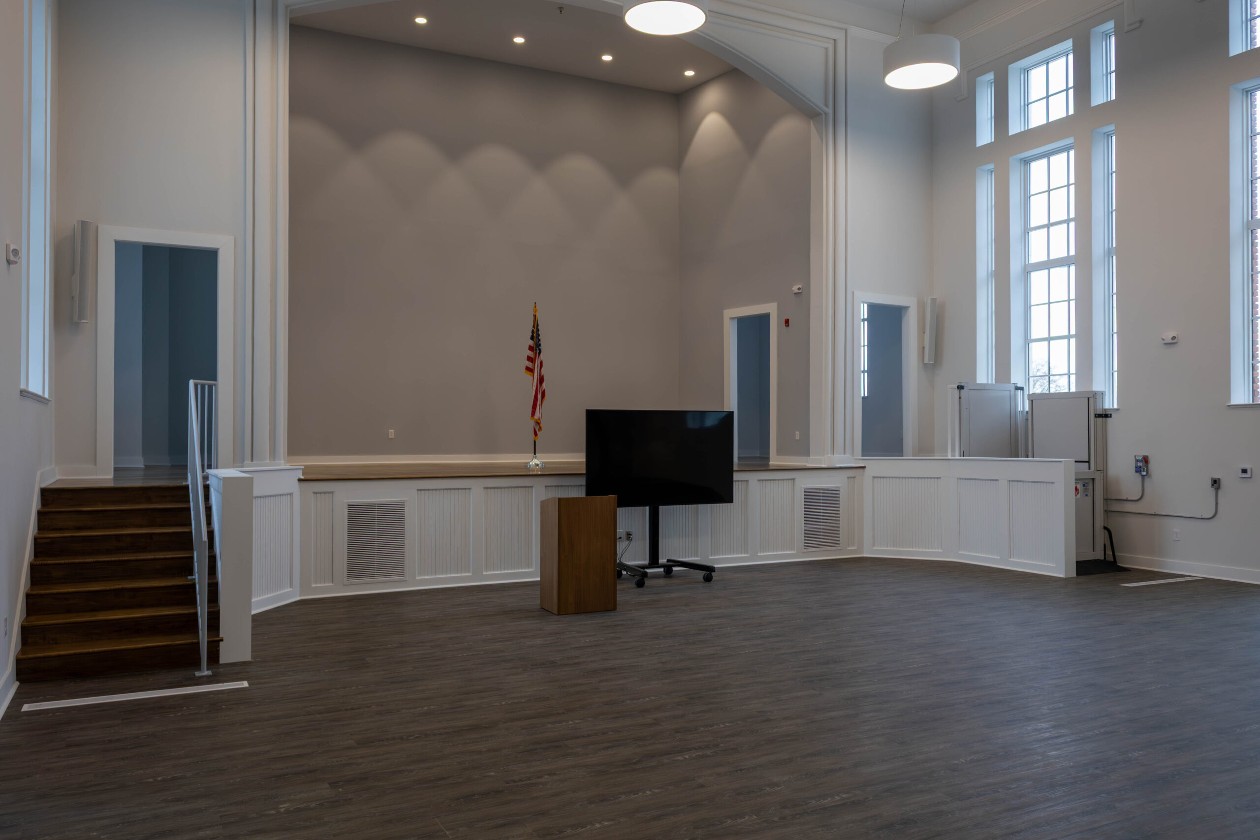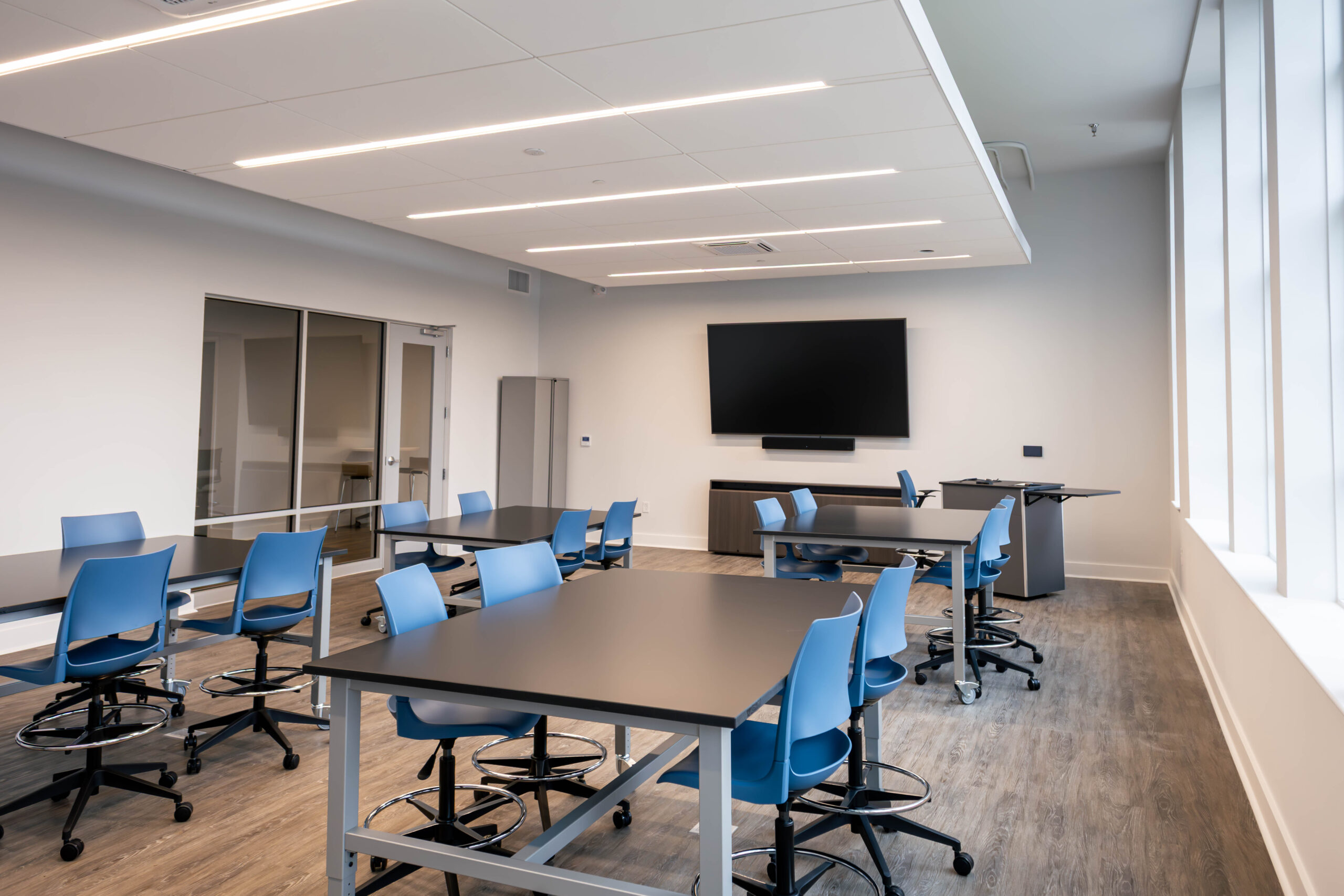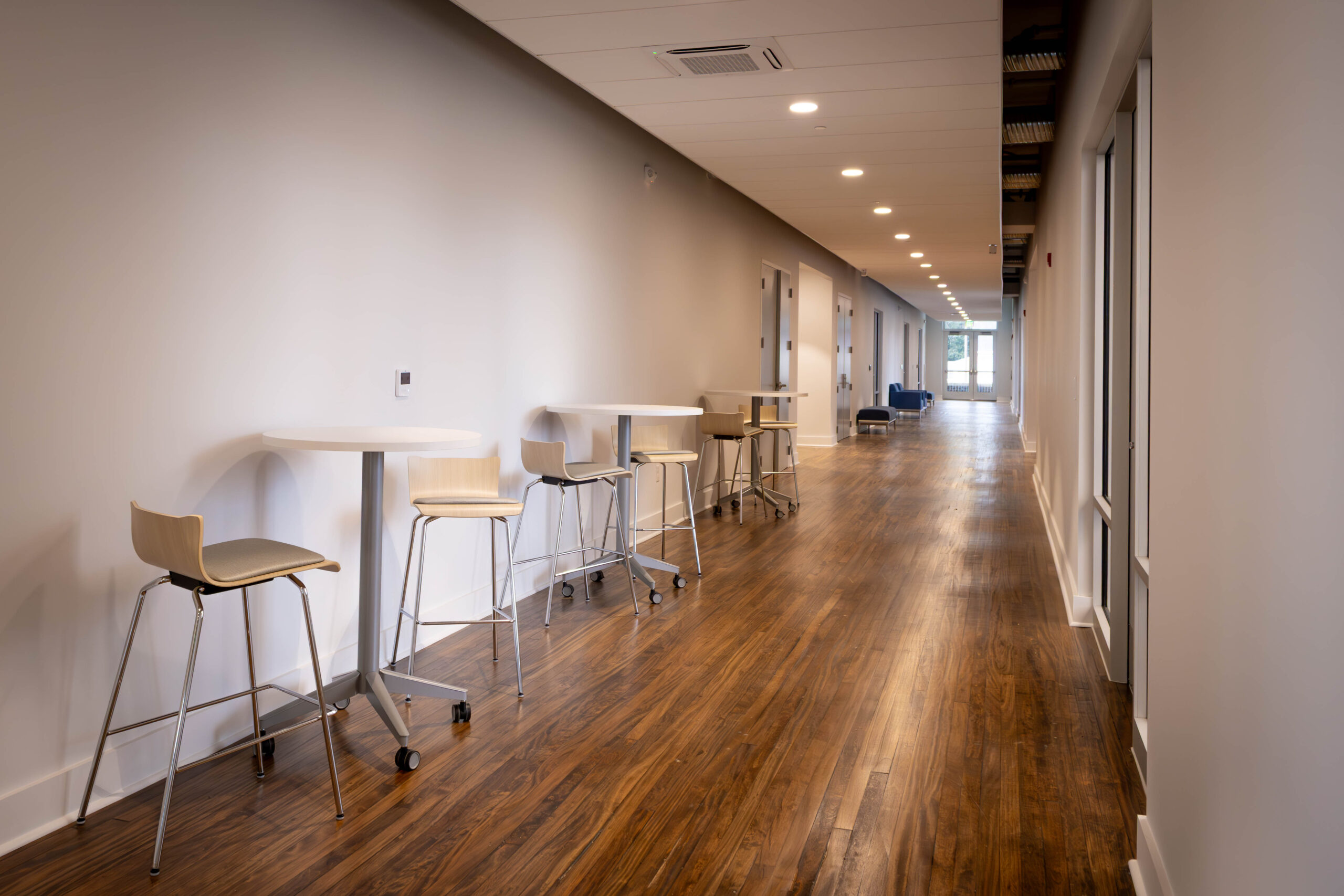 The project involved the renovation of approximately 30,144 square feet of existing space and the addition of a new 1,551-square-foot two-story lobby entrance constructed directly adjacent to the historic structure. Interior renovations reconfigured the building to accommodate classrooms, offices, meeting rooms, and event spaces, along with a fully renovated commercial kitchen and associated support areas. Building system upgrades included the installation of a new sprinkler system and a two-stop elevator located within the existing building to improve accessibility. Due to the age of the building, some of the project challenges included compromised frame members, steel sash windows, and removing plaster walls for new wall assemblies.